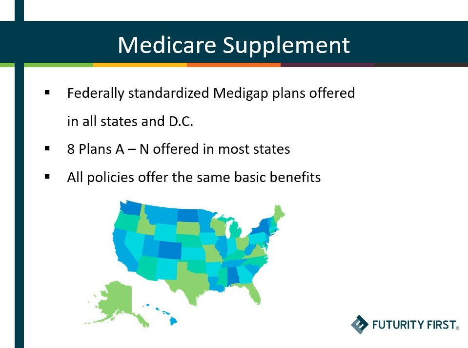 If you want to explore Medicare Supplemental insurance or Medigap, there are lots of options. You must have Medicare Parts A and B but then purchase a Medicare Supplement policy to cover certain costs that Medicare does not. There are 8 federally standardized Medicare Supplement insurance plans that are offered in most states – Plans A through N. They are offered by many different insurance companies.